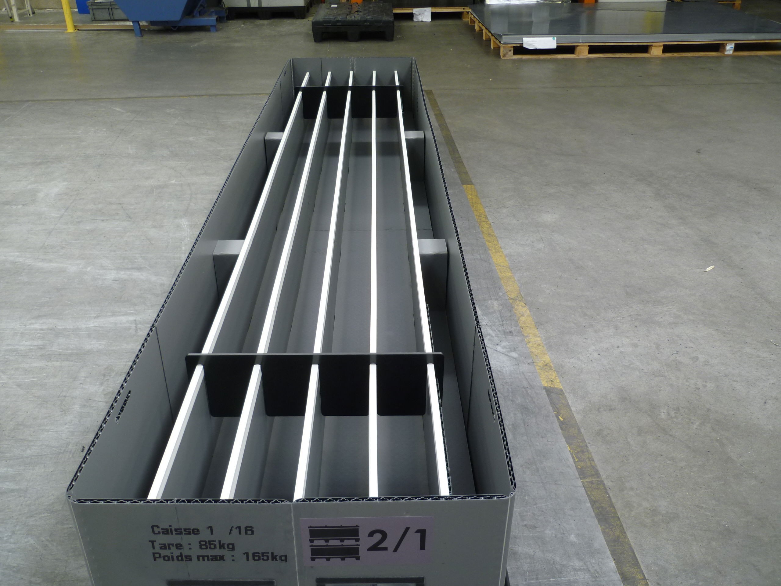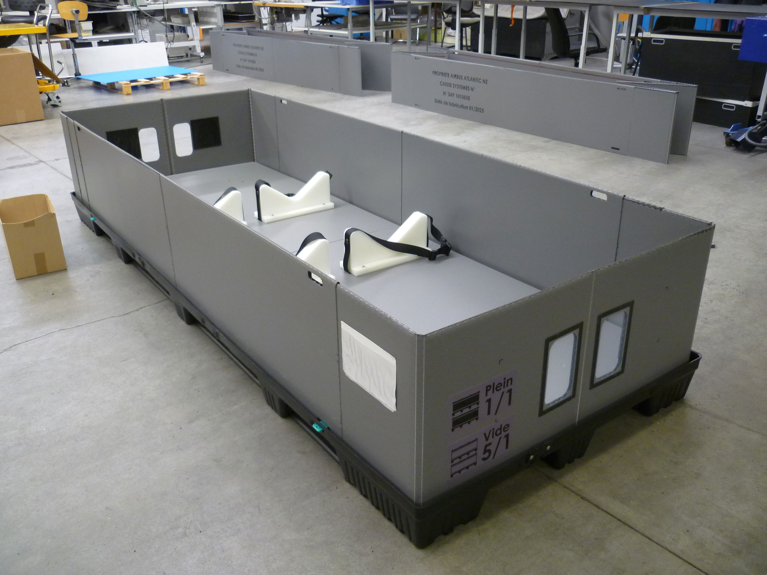 Ces dimensions, développées en collaboration avec nos clients de l’aéronautique et du ferroviaire, permettent de conditionner efficacement des sous-ensembles structurels, des profilés, des équipements mécaniques ou électriques, tout en réduisant le nombre de contenants nécessaires par référence.
